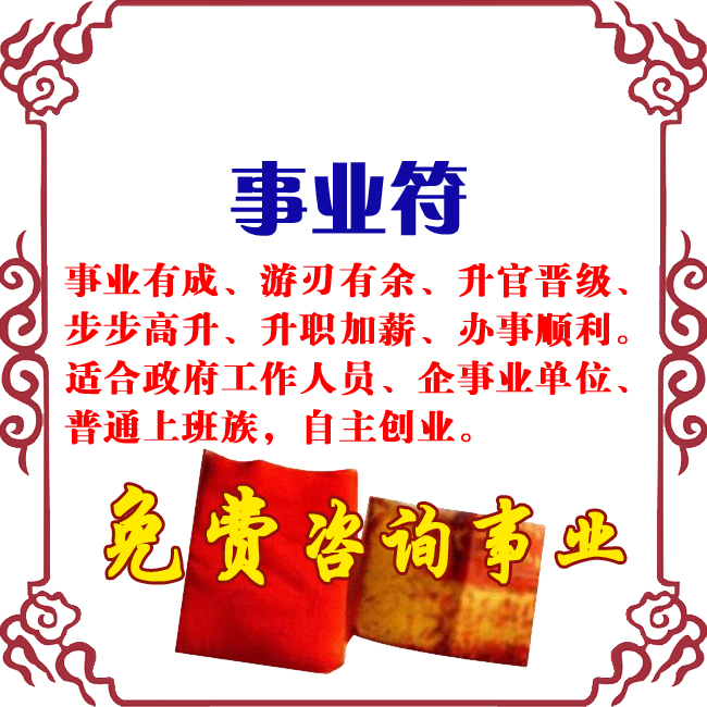 每个人的成功离不开贵人的帮助,团队合作,其利可断金,如果一个人闭门造车,单打独斗,难以取得大的突破和发展;利于【事业符】可帮助自己招贵人缘,招来好运,如人们说的“命不好,运好”,帮助自己职场仕途中能够消除障碍帮助步步高升。