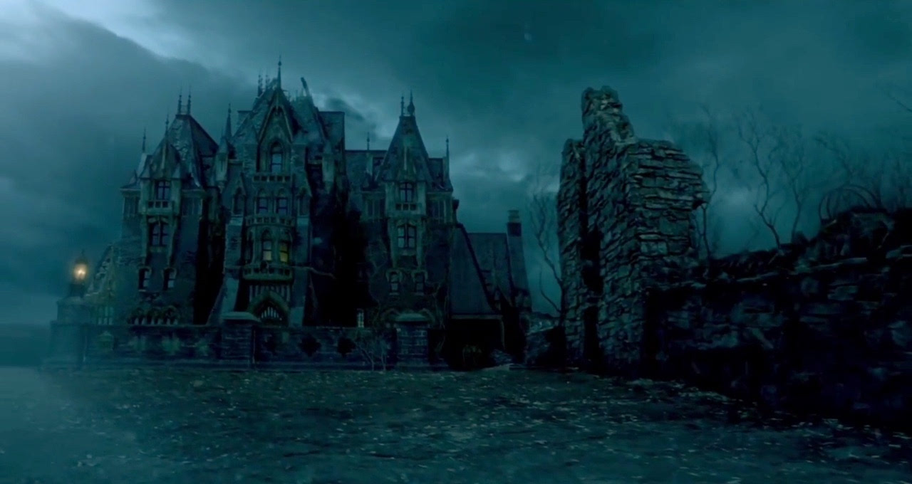 D、黑色浓雾笼罩下的幽暗城堡,四周枯树丛生,蝙蝠飞舞
