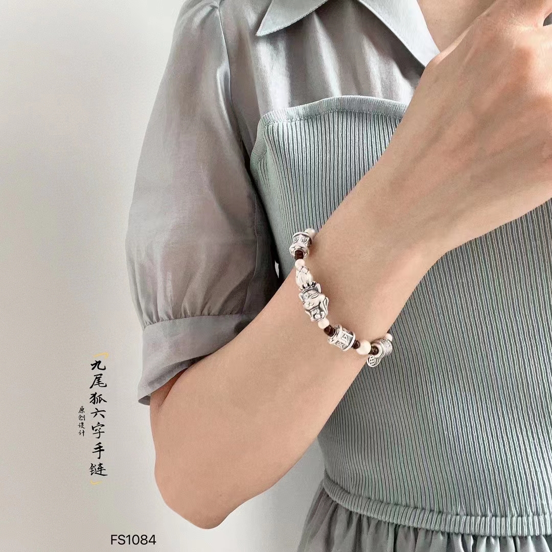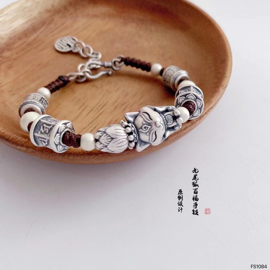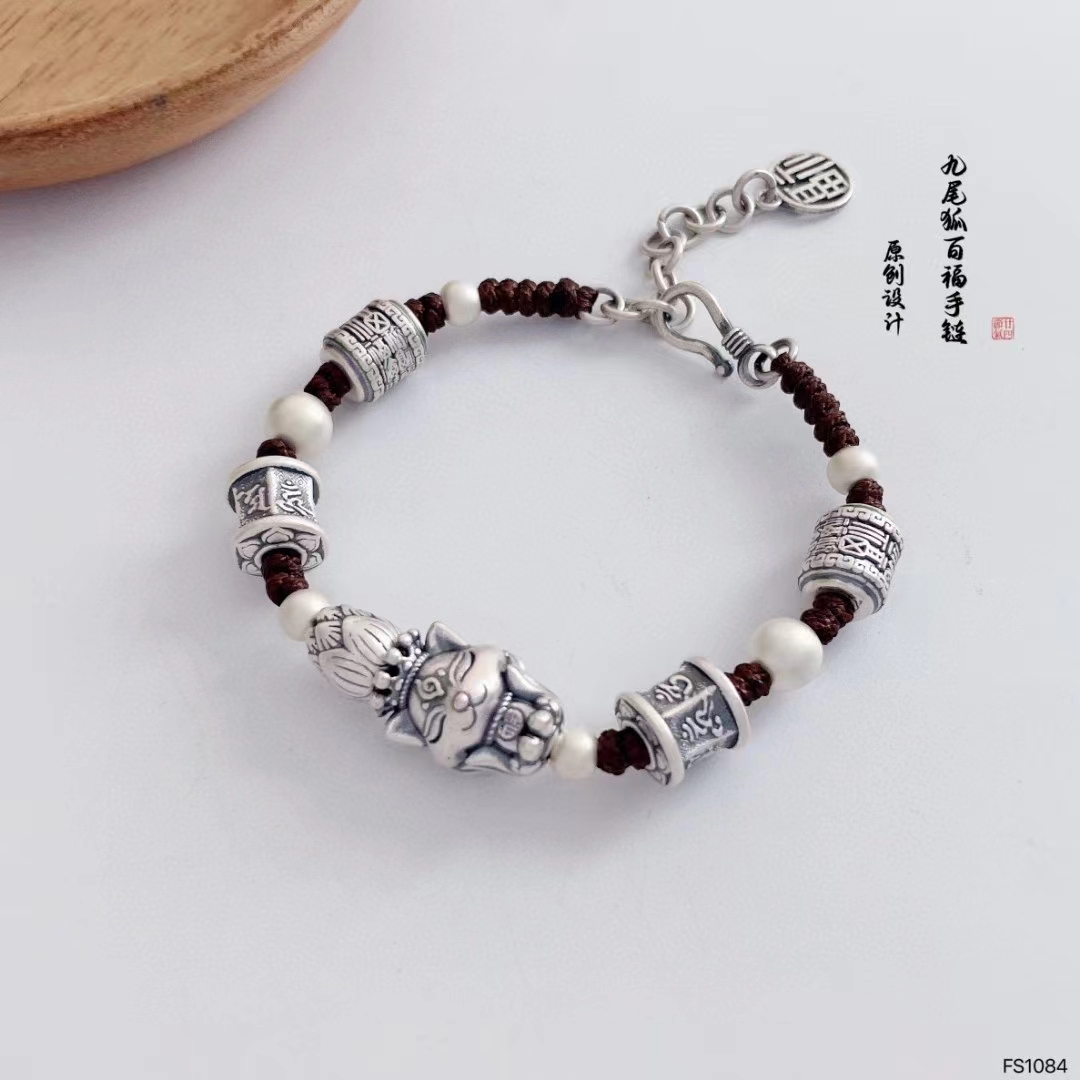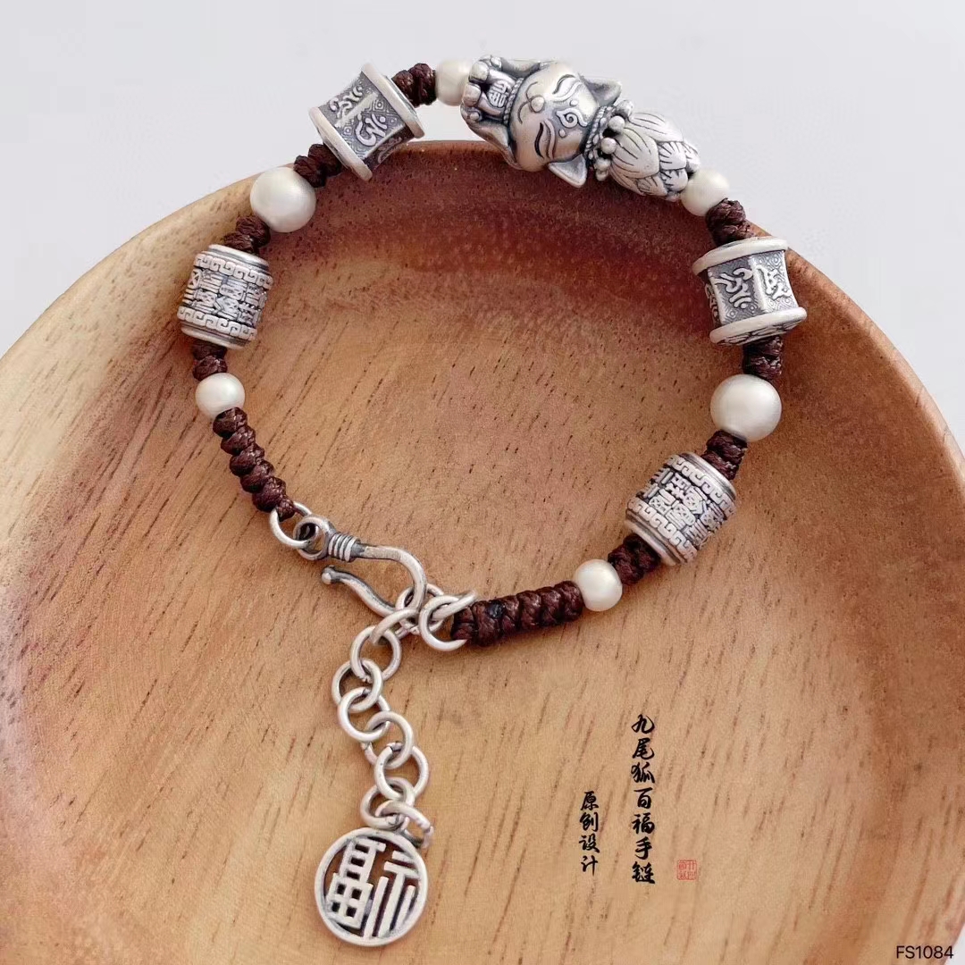 w纯银九尾狐手链男女款复古编织百福转运珠手绳手串