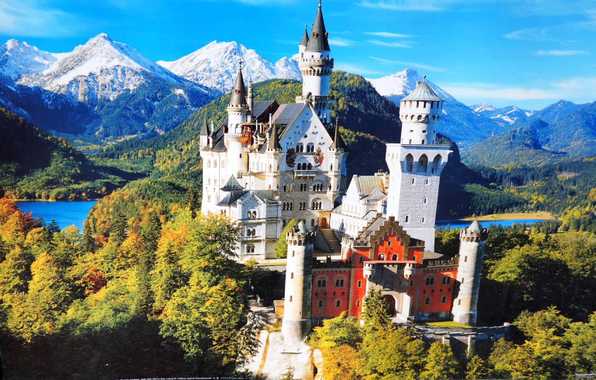 A、蓝色湖泊映衬下的宁静城堡,景色怡人