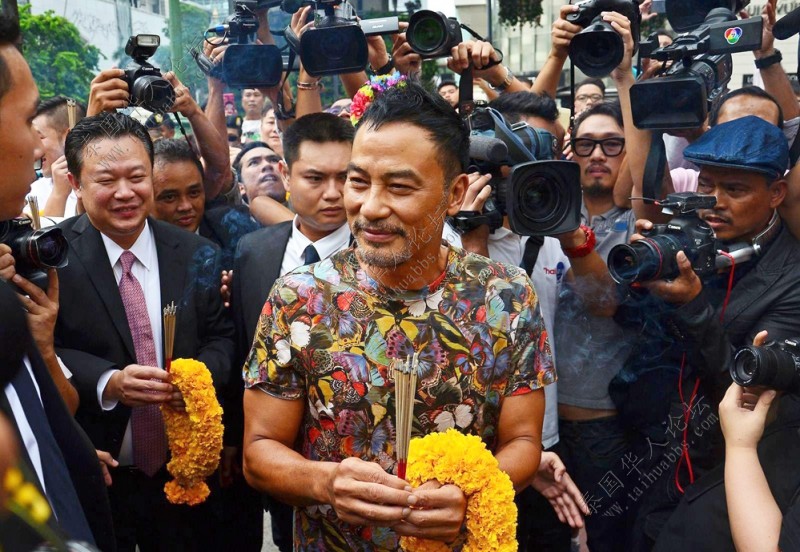 香港著名影星任达华和米雪于在泰国旅游与体育部部长科布坎恩女士的陪同下去拜四面佛,现场,任达华和米雪都为四面佛献上花环,上了香,非常虔诚。