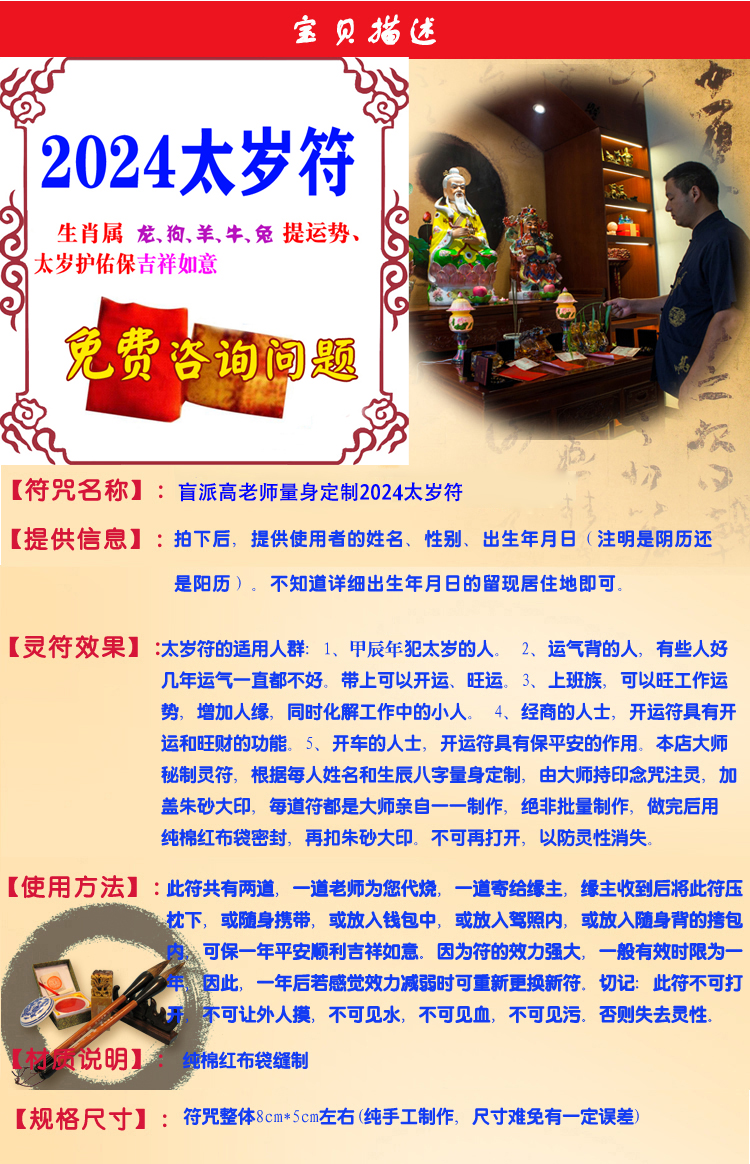 2024年犯化太岁十二生肖龙狗羊牛兔本命年平安护身锦囊符咒